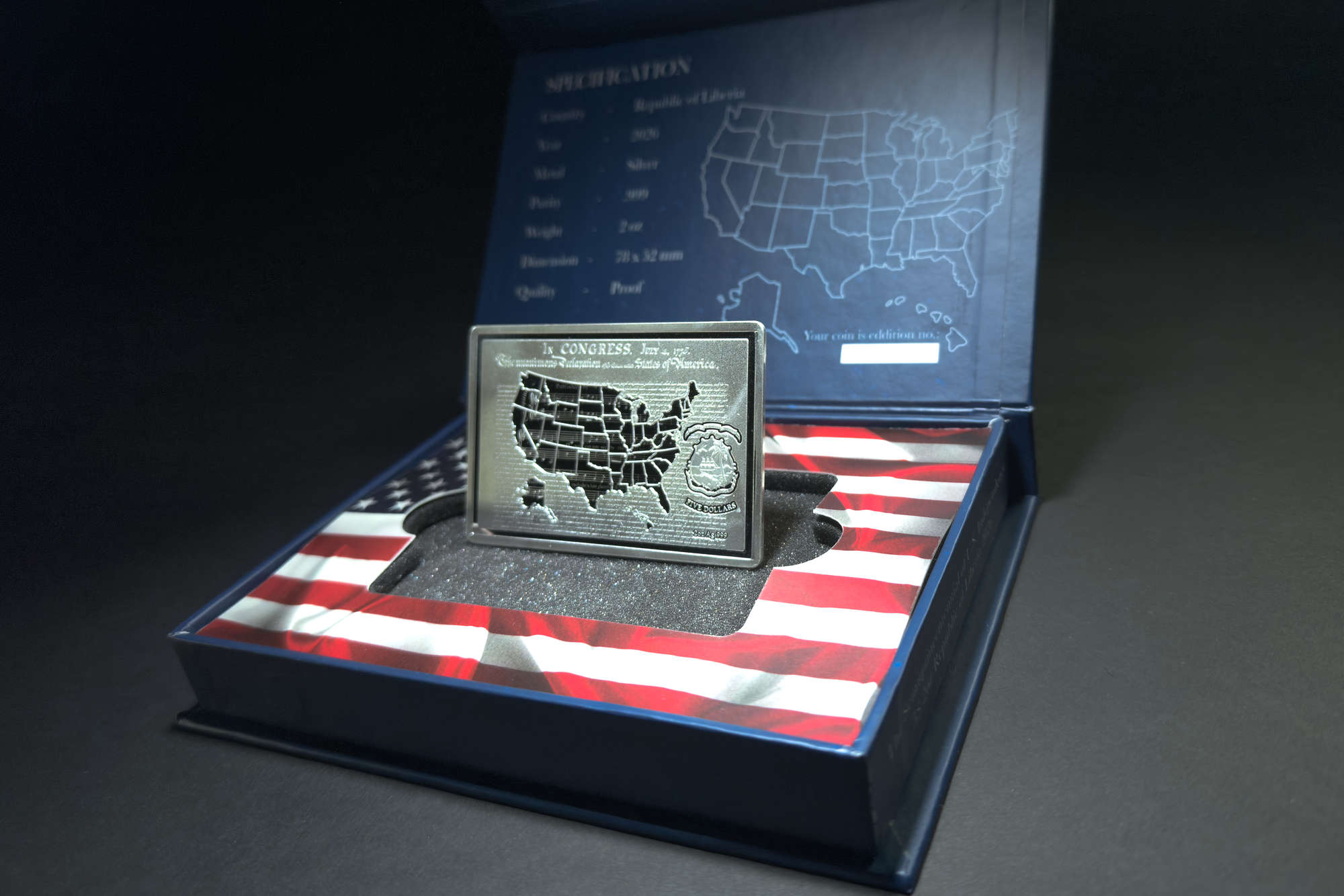 | $5 (Liberia) | 62.2 g of 0.999 silver | 78.0 x 52.0 mm | Proof | 500 |