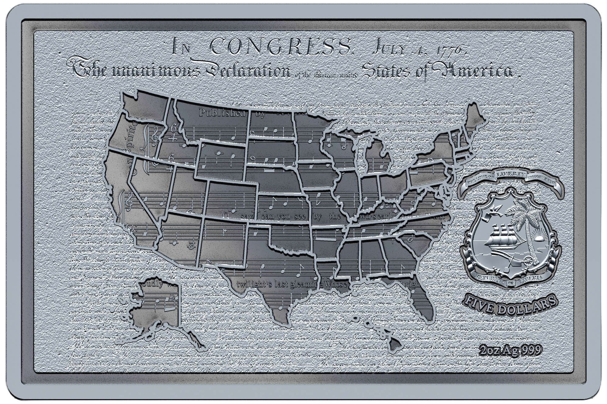 It’s the obverse that for me, is the star of the show. A very clever composition has an outline map of the fifty states set over a textured copy of the original Declaration of Independence. The map forms a window through that, revealing a sheet of musical notation containing the national anthem. It’s a terrific amalgamation of three quintessentially American icons, and exhibits some extremely high levels of detail. The Liberian national emblem sits to one side.