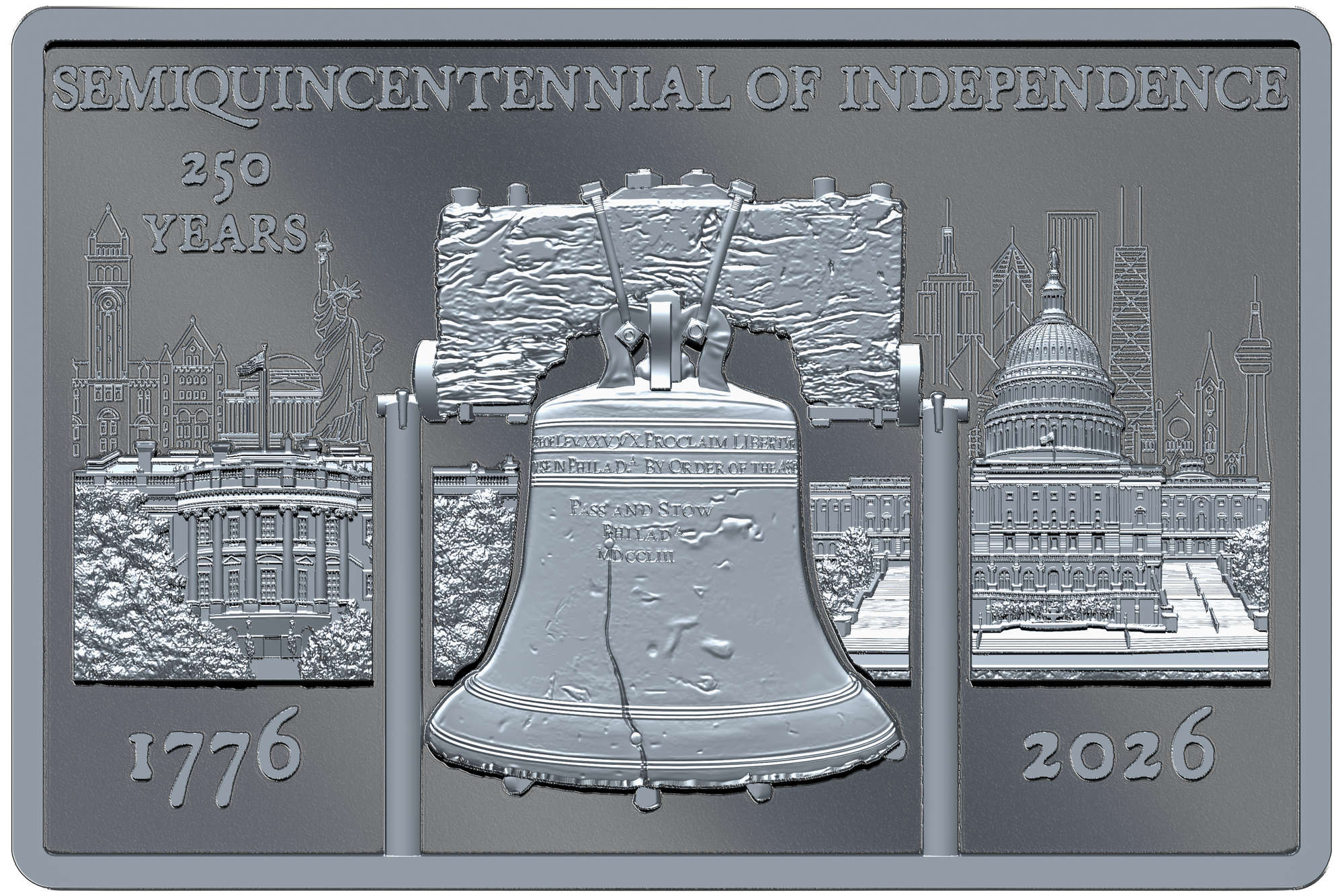 Pik Coins new two-ounce silver offering leans heavily on that imagery, especially on the reverse face. Here we see the famous Liberty Bell as the central focus, flanked by the White House on the left, and the Capitol building on the right. Micro-engraved behind those are other icons, like the Statue of Liberty, the Empire State Building, the Jefferson Memorial, and the Old Post Office, amongst others.