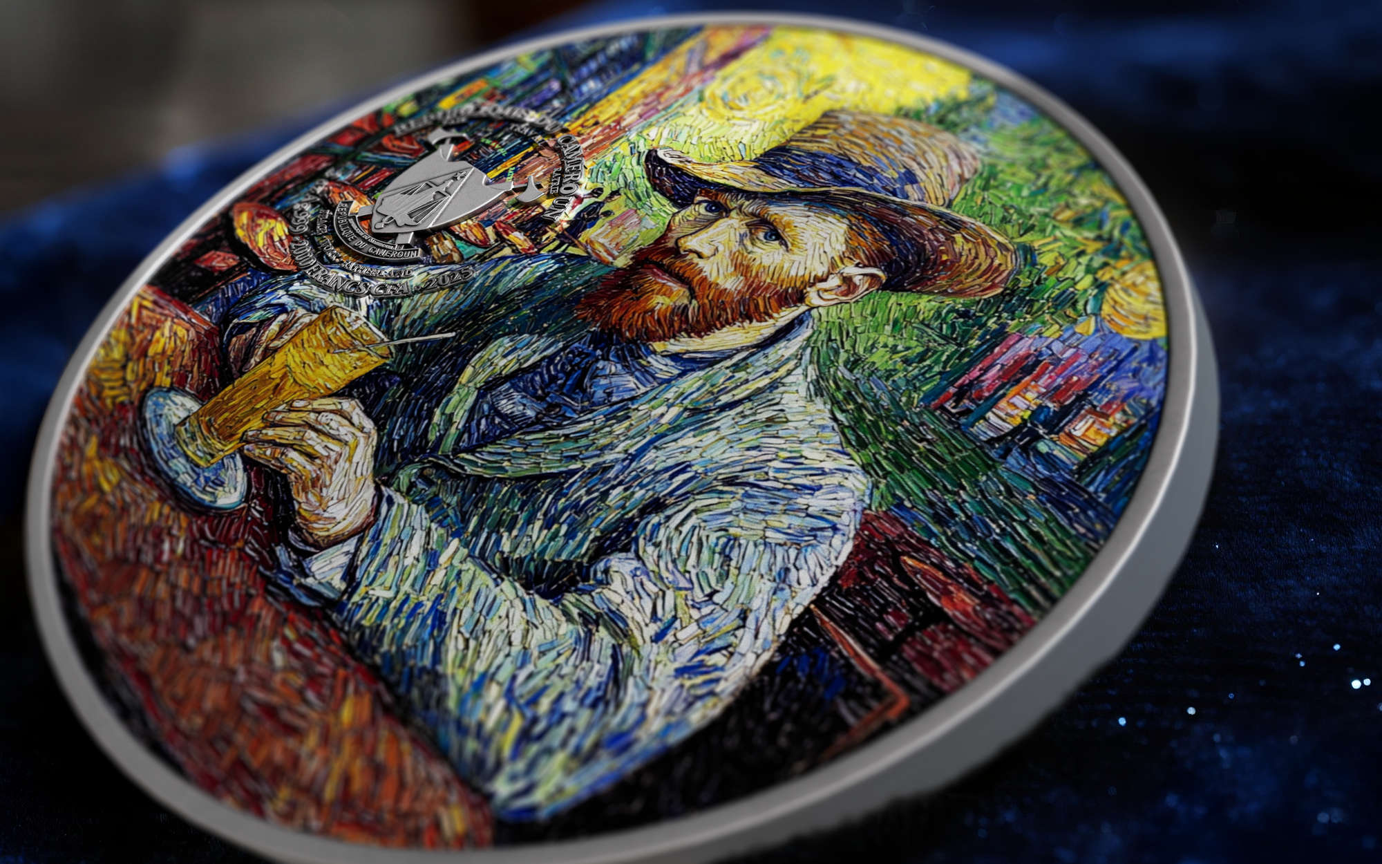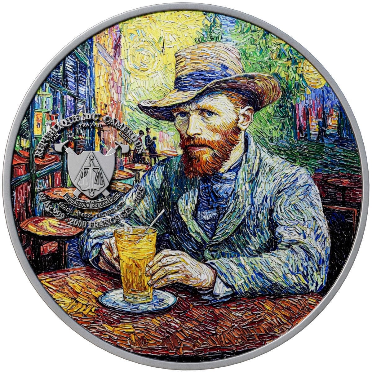 On the coin’s reverse face is a reproduction of the painting, which is beautifully textured to match Van Gogh’s iconic style, The colouring looks vibrant, and well graduated. It’s cropped to suit the round coin, of course, but importantly, the essence remains, and it loses very little in the transition. The obverse is superb, and an original work, but entirely in keeping with the artist’s style. Van Gogh was a prolific self-portrait painter, producing over 35 of them in the last few years of his life, and one of them, ‘Self-Portrait with Grey Felt Hat’, painted in late 1887, has him wearing almost identical attire. Here, however, he is placed in the café he made his subject. Heavy texture is employed to fine effect, again.