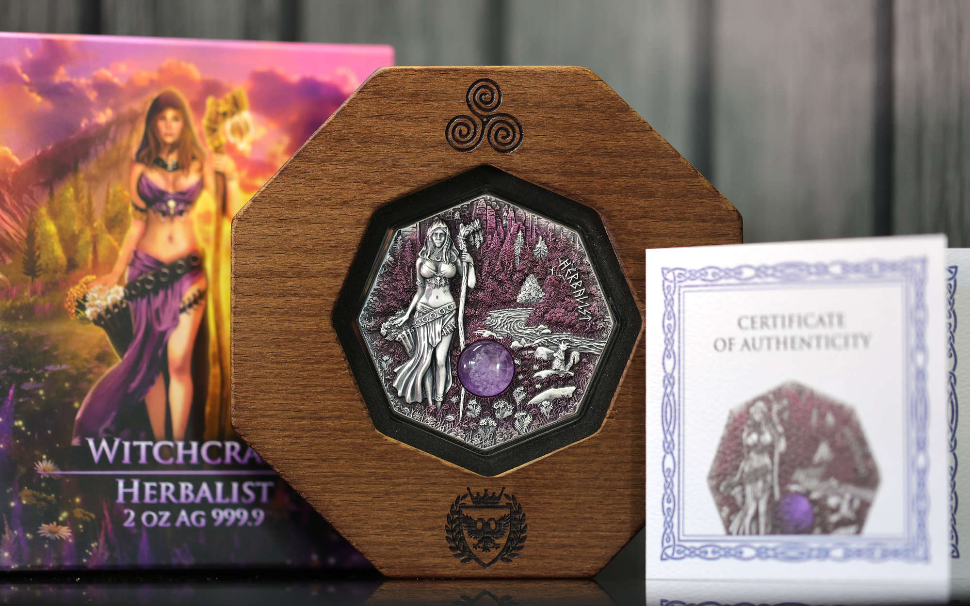 I’ve finally managed to set up a small space in the office so we can get some actual coin images of our own on the site with a bit more regularity. As promised, we’re starting off with the premium version of Germania Mint’s excellent 2025 Witchcraft: Herbalist coin, tipping the scales at two ounces, and sitting above two smaller variants that we did a photoshoot of last November.
