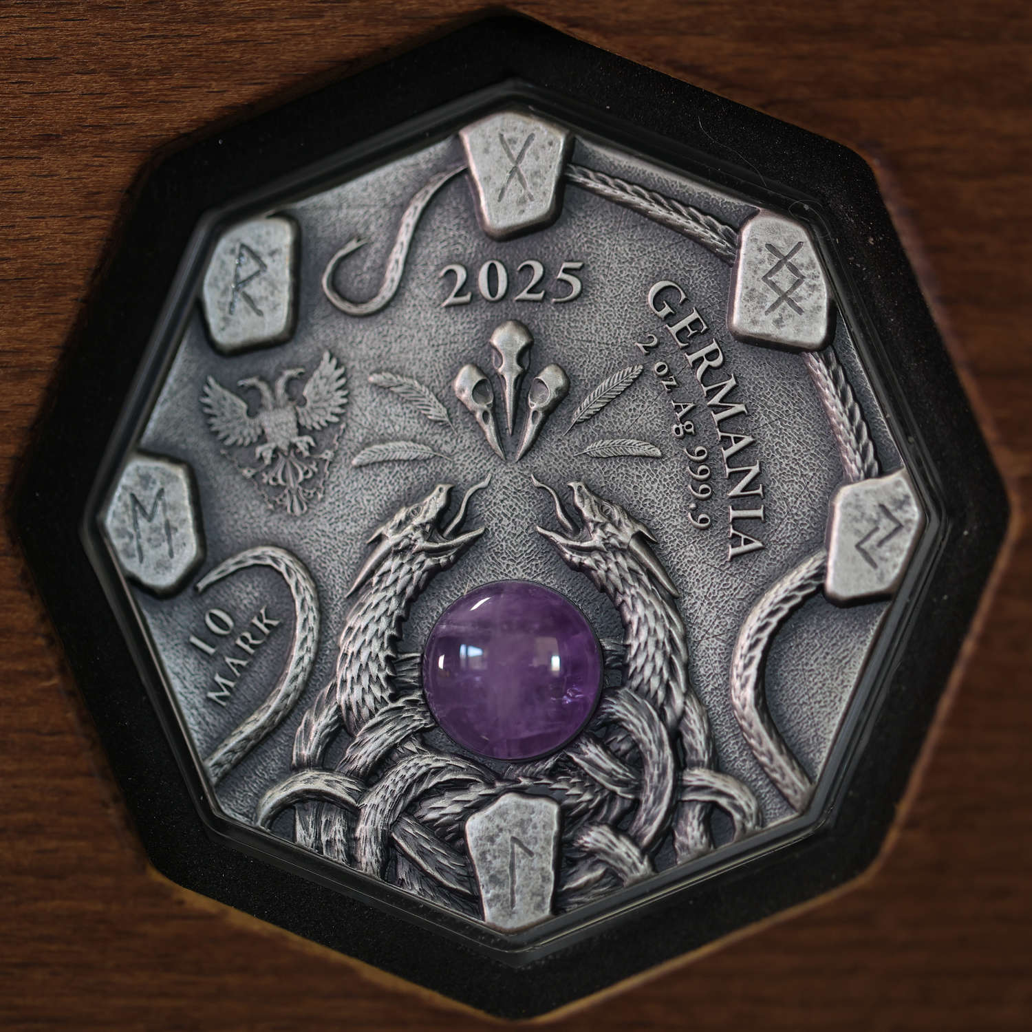 10 Mark (Undenominated)62.2 g of 0.9999 Silver55.0 mmAntique, UV Colour, Amethyst500