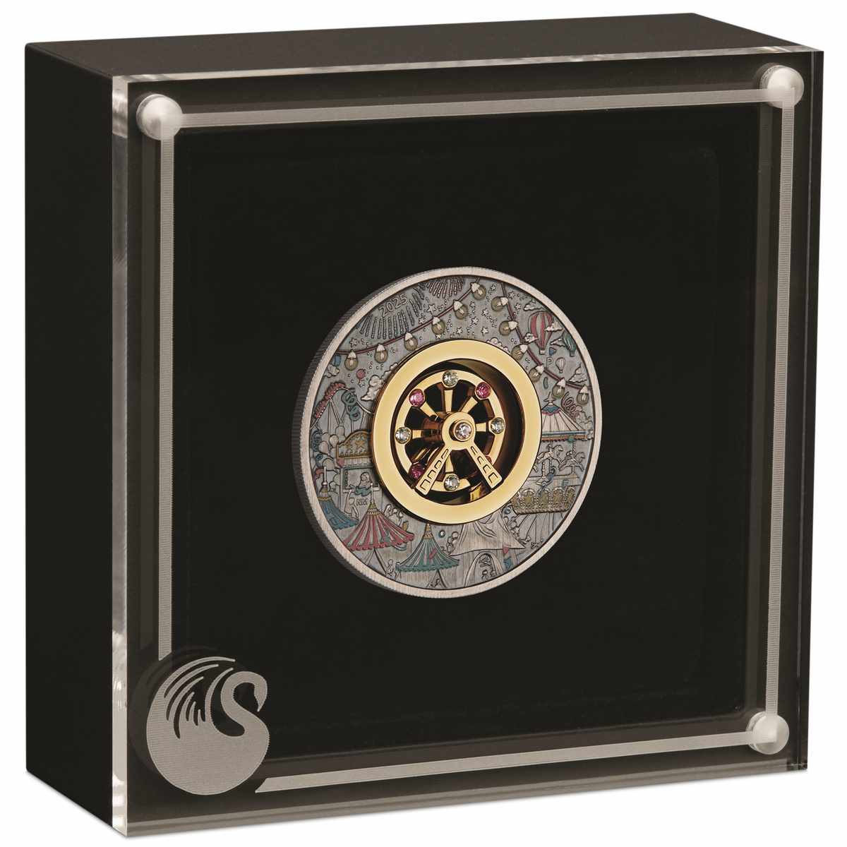 The coin’s border features a subtly coloured montage of fairground scenes, and in that centre, fully gilded, is a rotatable, Swarovski Crystal adorned, miniature Ferris wheel. It’s all a little ridiculous, of course, but also completely on theme. If you have a penchant for weird coins, this should be right in your wheelhouse. Ferris Wheel is issued for Tuvalu, which means the effigy of King Charles III, this time by Jody Clarke, decorates the obverse. The same packaging as the Honey Bee coin is employed, and it’s of a great quality.