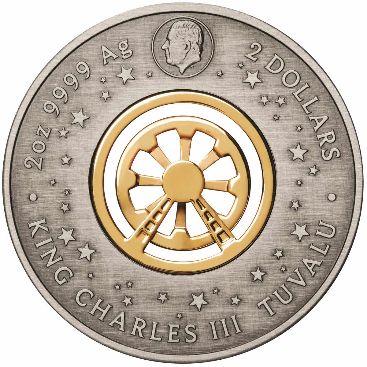 The second coin we’re looking at today is part of, what we call, the mint’s esoteric centres range, and it fits right in. This range has a signature design element, and it always sits in an aperture through the centre of an antique finished coin. Earlier issues have bordered on the weird, and we’ve had spinning charms, a compass, a Rubik’s Cube, and even domes filled with gold or silver flake. Check out our profile.