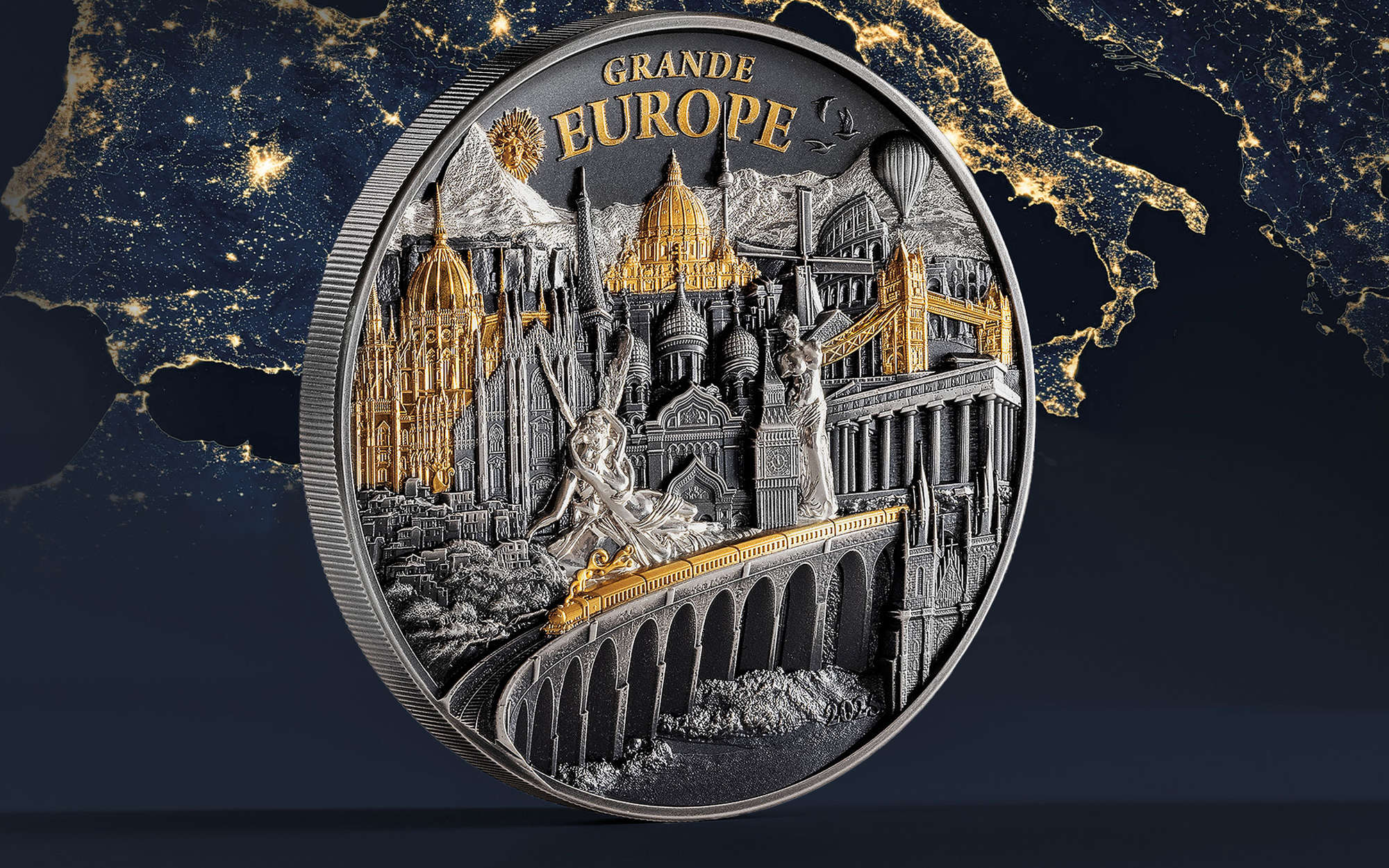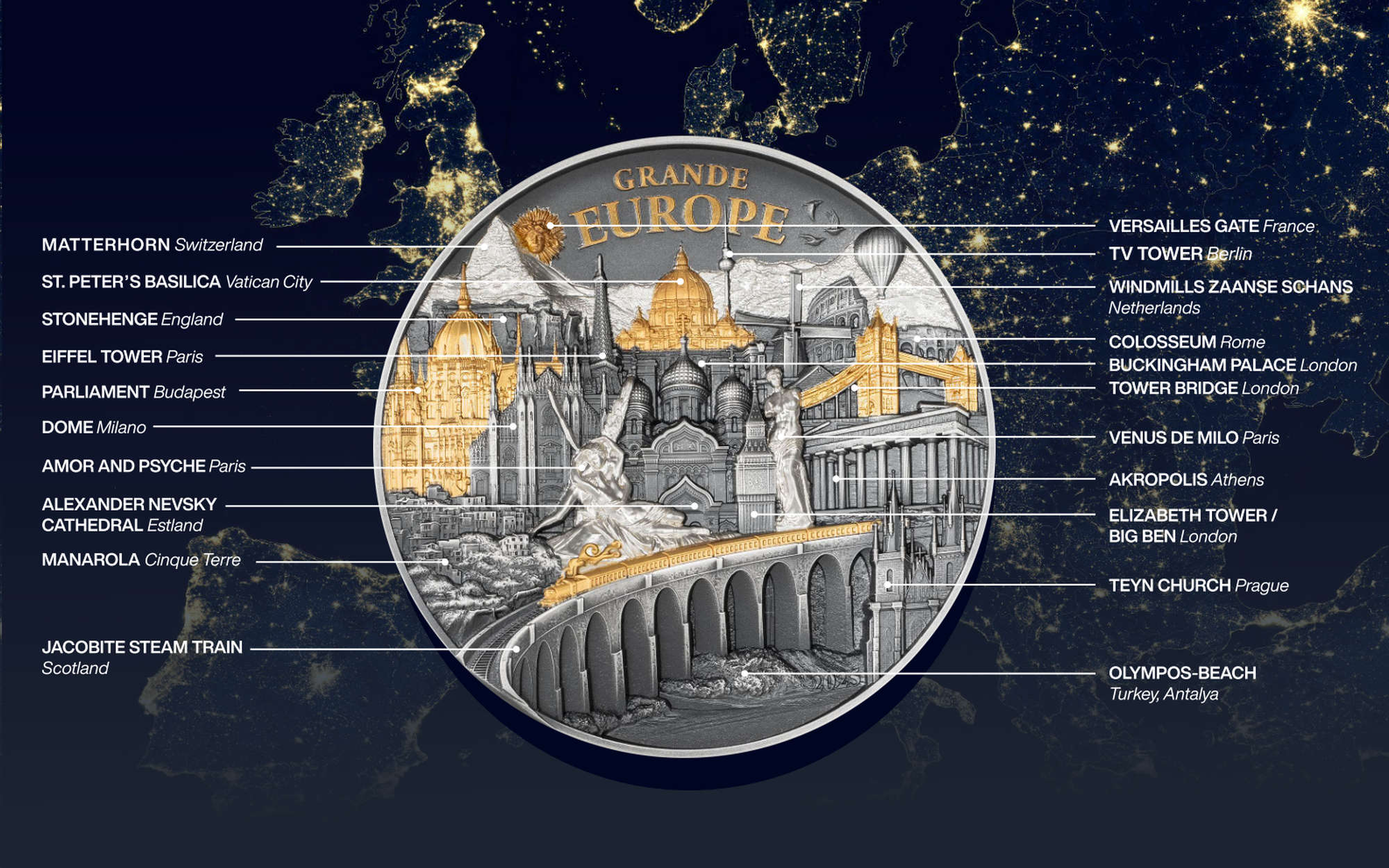 This three-ounce silver coin, resplendent in its antique finish with gilded highlights, takes us back to a time when people travelled around Europe, taking in the famous sites, and there are few places on Earth like Europe for packing those in. The design is an ambitious one, seeking to cram into a single design some 21 different sites of interest, from a beach in Turkey, to a railway in Scotland. There’s a graphic below that points them all out, and it’s a varied selection, from a couple of natural features, to the architecture and art of man.