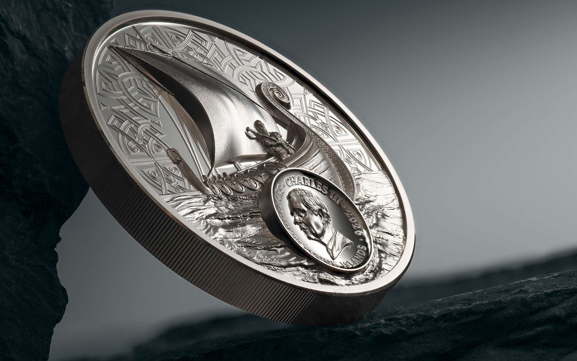 The coin is a real highlight to go out on. The reverse face keeps the series design ethos in place by depicting a trio of figures in traditional garb, and in smartminted high relief. In this case, the central figure is meant to be the infamous Viking warrior, Ragnar Lothbrok, dressed in furs, and wearing the horned helmet, which Vikings didn’t use except in popular culture over the last 200 years. The helmet and sword hilt are gilded on the three ounce silver coin, but not on the one ounce. He is flanked by his sons, Ivar the Boneless, and Bjorn Ironside. The obverse has a superb rendition of a Viking Longship, under sail, with a Norse-style pattern in the background field. A stunning coin.