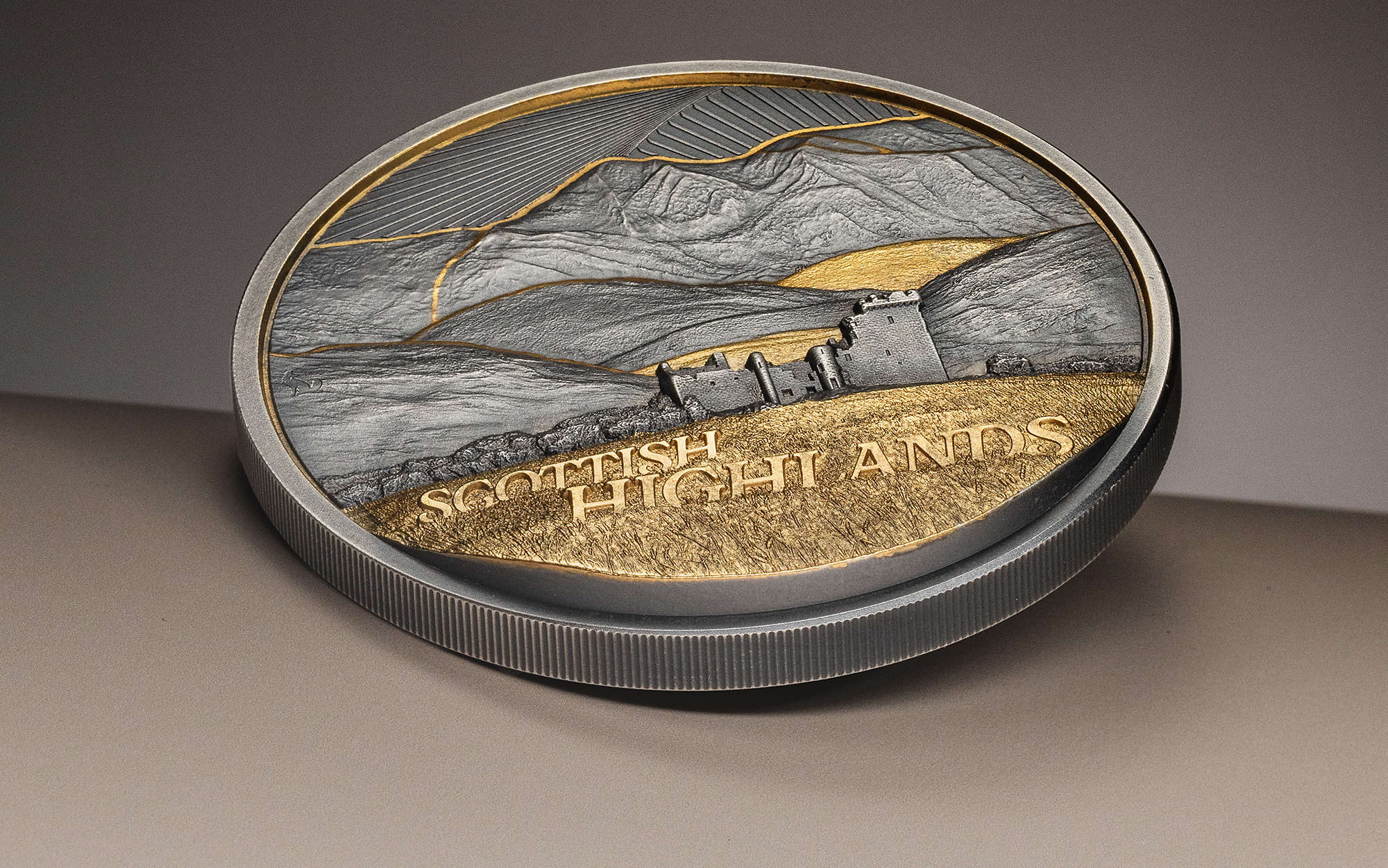 Golden Landscapes is all new, and uses layered high-relief, antique finishing, and gilded highlights to depict a scene of the Scottish Highlands. A stunning region of the world, full of mountain vistas, and history, both of which are shown on the coin, the latter by the depiction of castle ruins. The foreground cleverly employs the gilding to show us a golden cornfield, maybe used in the production in one of the greatest creations in human history – single malt Scotch…