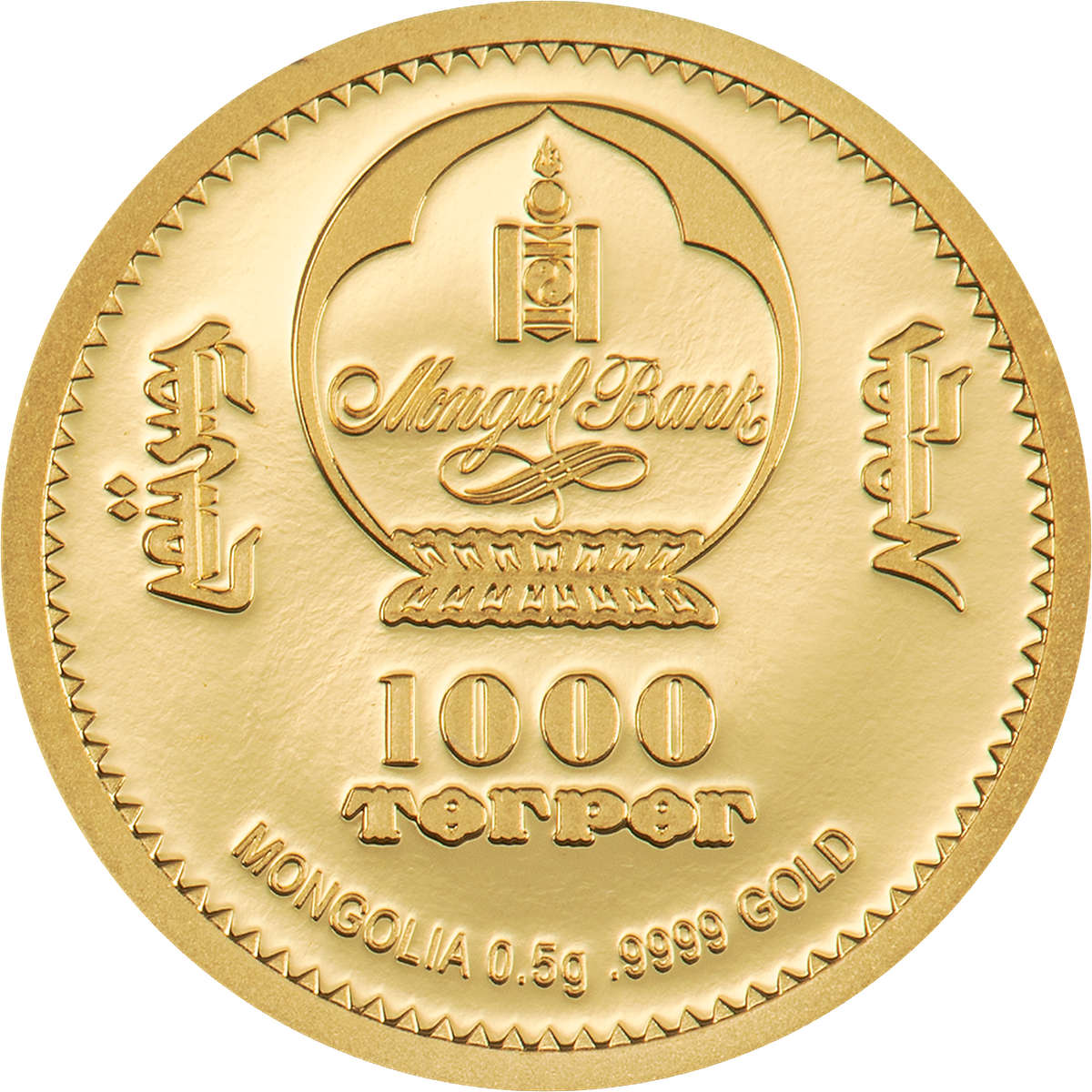 | 1,000 Tögrög (Mongolia) | 0.5 g of 0.9999 gold | 11.0 mm | Proof | 5,000 |