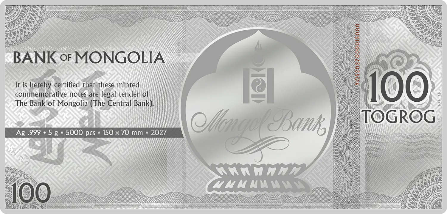| 100 Tögrög (Mongolia) | 5.0 g of 0.9999 silver | 150.0 x 70.0 mm | Prooflike | 5,000 |