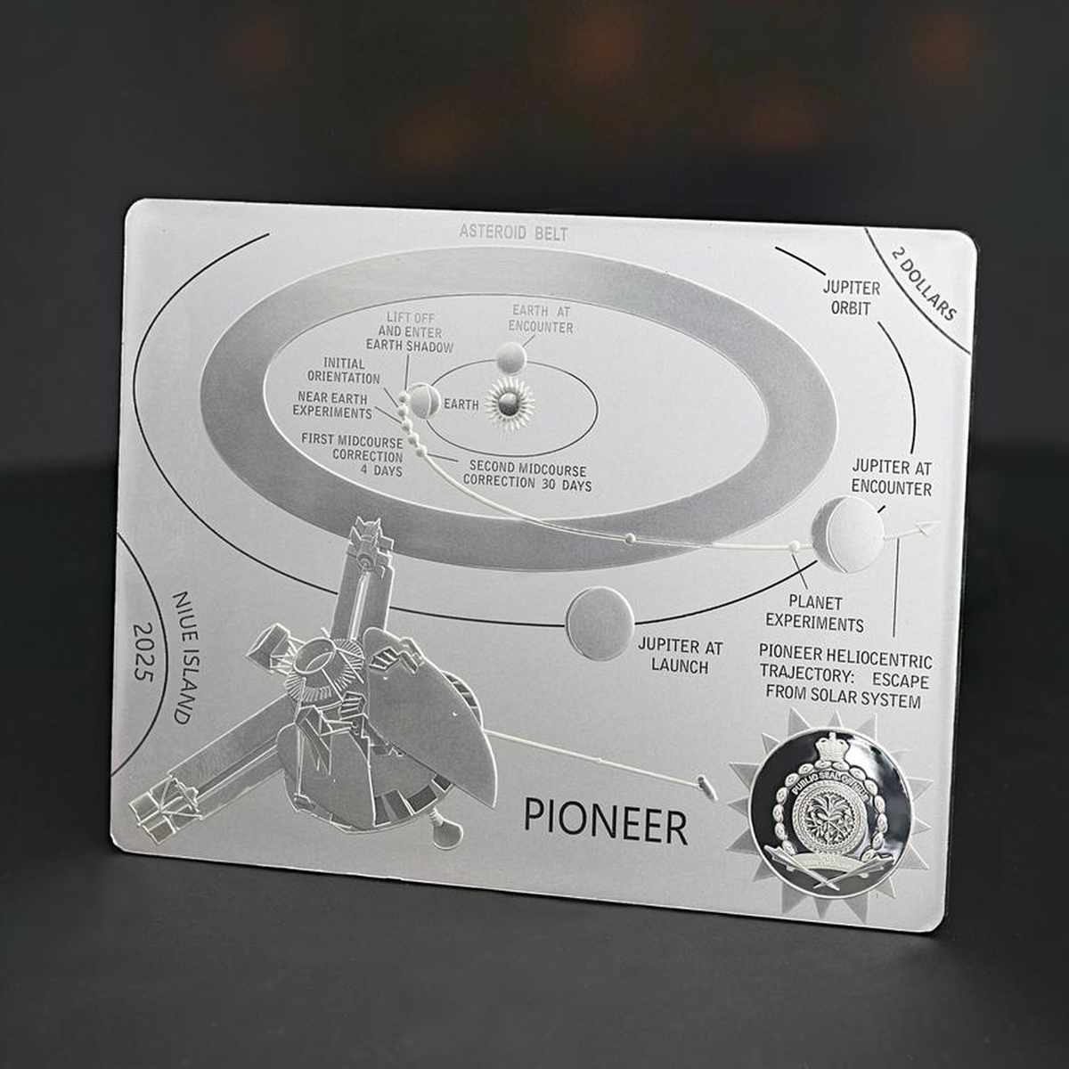 On board Pioneer 10 was a plaque similar to the famous one affixed to Voyager 1. The brainchild of popular scientist, Carl Sagan, it’s designed to tell any alien discoverer of who built the craft, and depicts a man and a woman (alongside the probe for scale), a hydrogen molecule, the location of Earth relative to 14 pulsars, and Pioneer 10s route through our solar system. A clever item, and a cool inspiration for Powercoin’s latest silver coin.