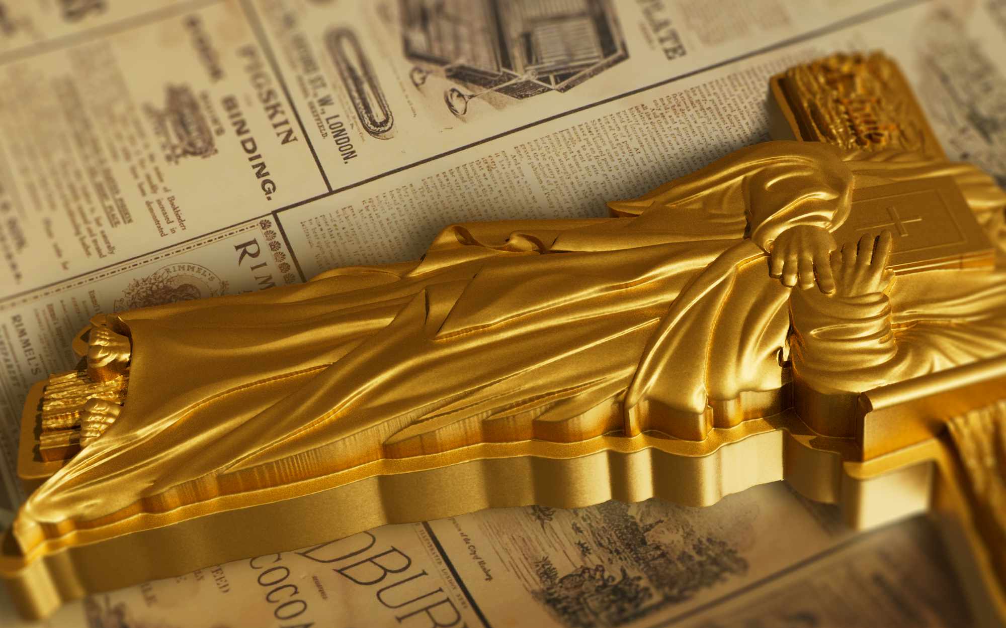 Each issue is available in a choice of antiqued, or fully gilded finishes, is packed with high-relief, and comes presented in a solid acrylic display block, inside a themed slipcover incorporating a certificate of authenticity. We’ve collated images of the coins and each variant below, along with abridged details from the mint itself. A very striking religious coin series, that should have considerable appeal to that large market, either as a complete series, or for an individual design with particular resonance.