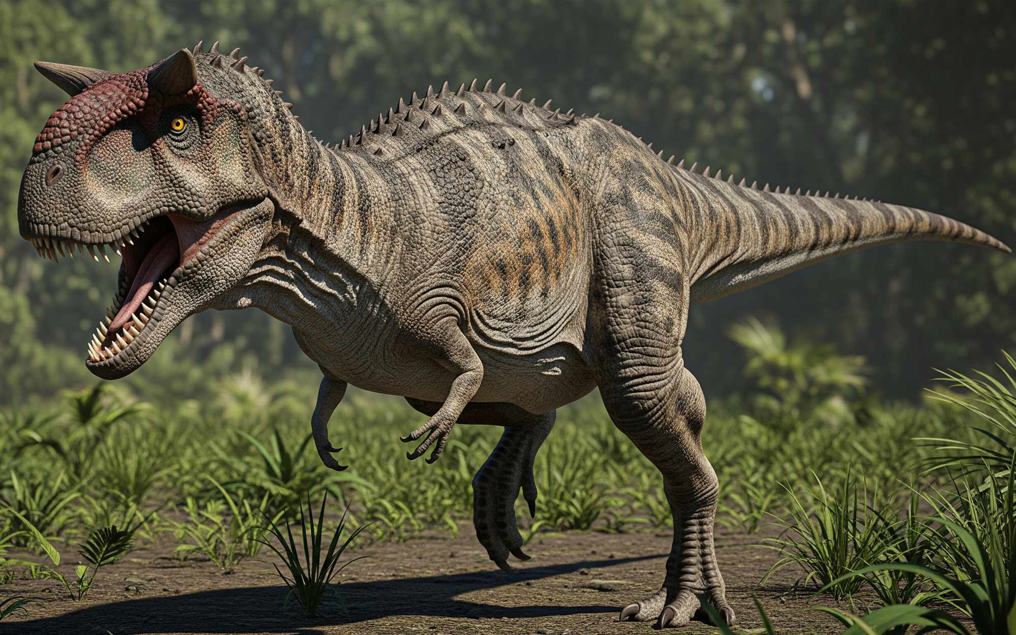 Carnotaurus possessed a deep skull and a robust neck, although its forelimbs were remarkably short and vestigial, even more so than those of T. rex, with fused, immobile digits lacking claws. In contrast, its hind limbs were long and muscular, suggesting adaptations for swift running. Fossilized skin impressions indicate that Carnotaurus had a scaly hide, characterized by a mosaic of small, non-overlapping scales and larger, irregularly spaced bumps along its body, with no evidence of feathers. Analysis of its skull suggests a kinetic jaw system and forward-facing eyes, indicating stereoscopic vision. Its bite force was weaker than other large theropods, but its anatomy supports a rapid biting action, potentially for quickly injuring prey.