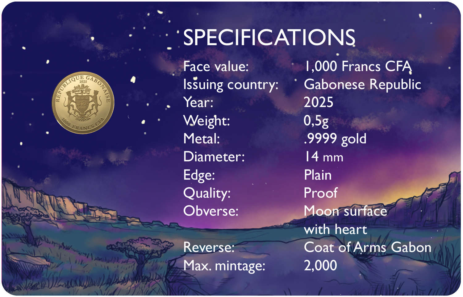 | 1,000 Francs CFA (Gabon) | 0.5 g of 0.9999 gold | 14.0 mm | Proof | 2,000 |