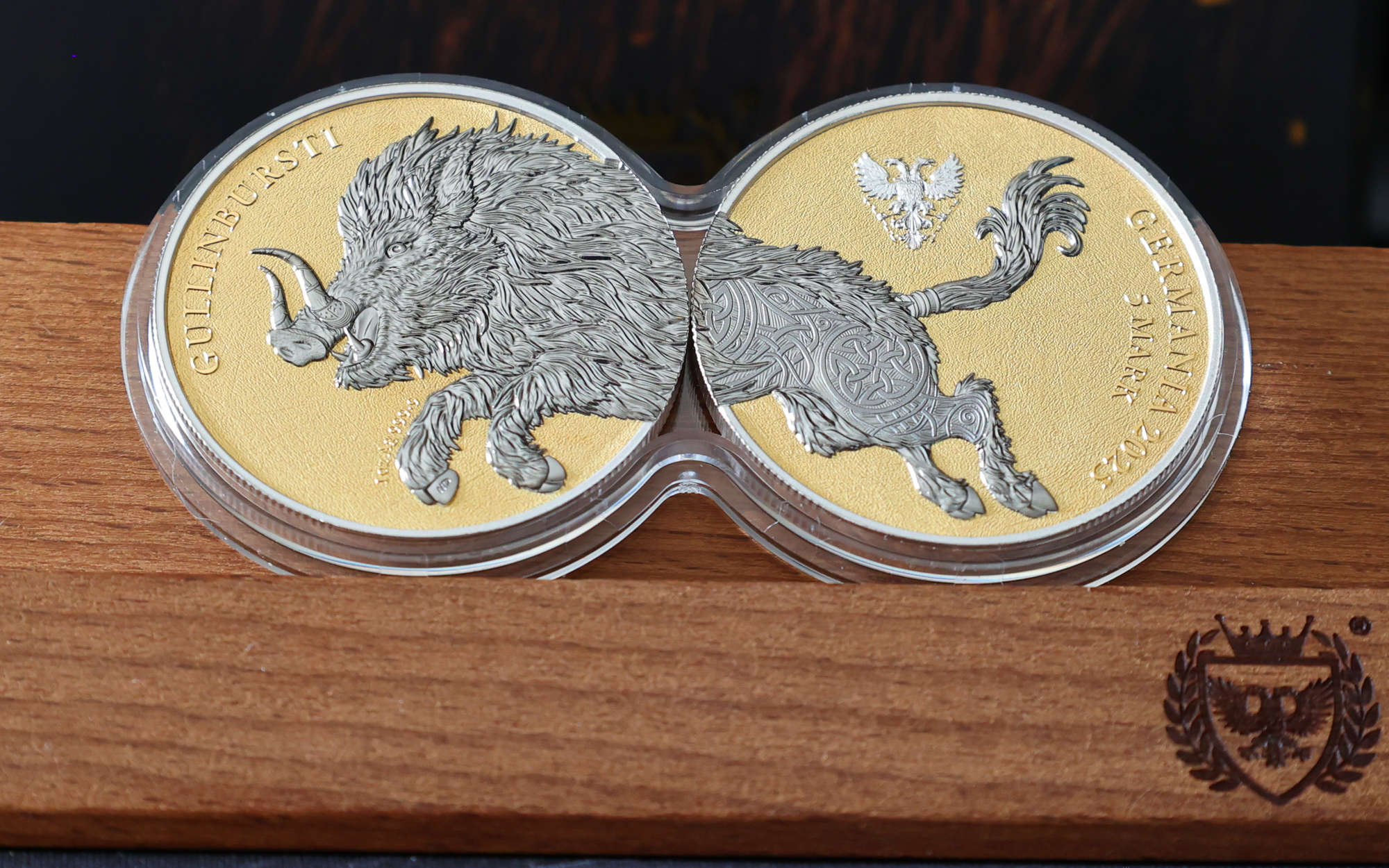 There are three variants of this coin in the range. The key coin is the 1 oz silver bullion, with a 25,000 mintage. We’d definitely recommend the two-coin capsule for the best effect. The Geminus variant is very neat. It comes with two coins, the first having a reverse with a black boar front, and an obverse with the gilded boar back, and the second coin is set up vice versa. The end result is that they can be displayed as either a ruthenium plated boar pair, or a gilded boar pair. Simple, but effective. The final variant is a 2 oz coin with some impressive levels of high-relief, This one has chameleonic colouring, rose-gilding, and some UV colour to differentiate it from the others, and a brilliant acrylic display frame. All are available now, and don’t forget to check out our own images lower down.