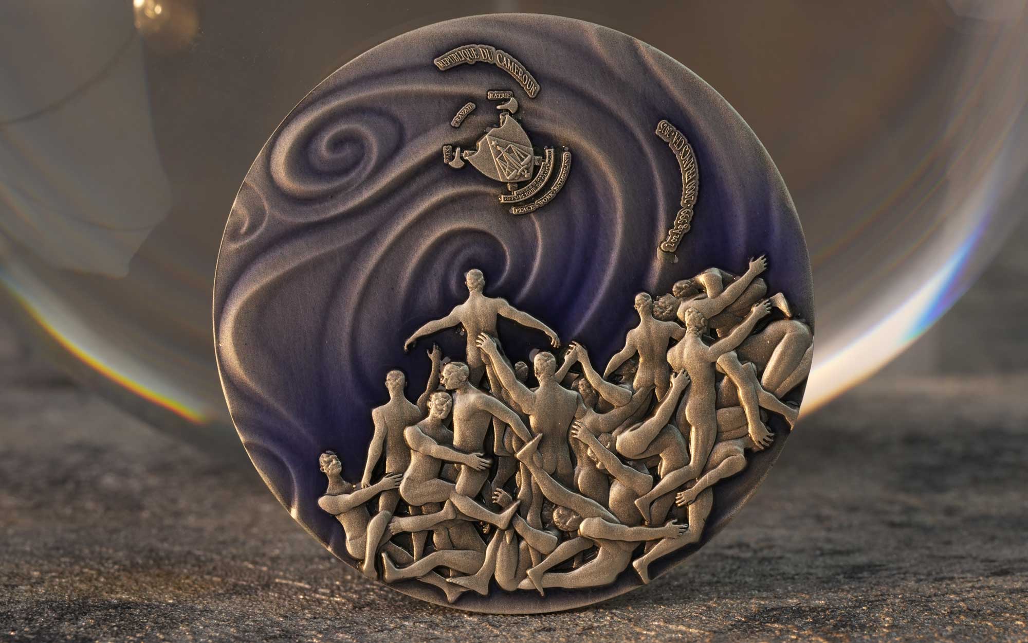 The reverse face features three mushrooms, the biggest one expertly defining the edge of the coin for a third of its circumference. It’s all replete with texture and high-relief, and when the lights go out, there’s a sprinkling of UV colour. The obverse is particularly inventive, featuring a mass of naked people intertwined, reaching out, and subject to the force of a psychic vortex behind them. This vortex also glows under UV light.